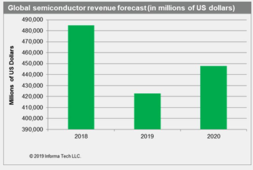 IHS Markit預(yù)計,2020年全球半導(dǎo)體市場收入將出現(xiàn)反彈,從2019年的4228億美元增至4480億美元,增幅會達到5.9%。這可能會讓英特爾、三星、臺積電、高通、Broadcom等全球頂尖半導(dǎo)體公司松一口氣。