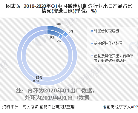 近年來,除“齒輪及其他變速、傳動裝置:滾珠螺桿傳動軸”外,其余產(chǎn)品的出口份額均有所下降。2020年第一季度,“齒輪及其他變速、傳動裝置:滾珠螺桿傳動軸”的出口額占到了中國減速機制造行業(yè)出口產(chǎn)品總出口額的89%。