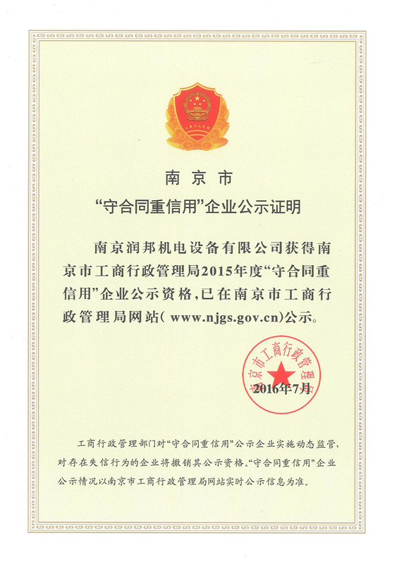 近日,接到南京市企業(yè)信用管理協(xié)會(huì)通知,我公司正式通過(guò)2015年度市級(jí)“守合同重信用”企業(yè)的認(rèn)定,并予授牌和頒發(fā)證書(shū)。